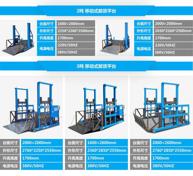 4. 安全防护:液压安全锁防意外坠落、防滑台面、防护栏 / 裙板、限位装置等。